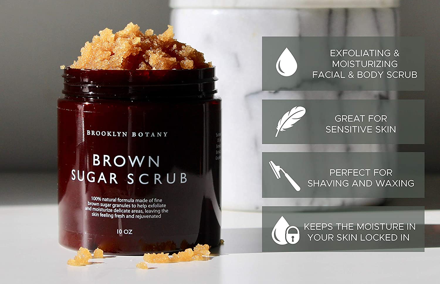 • NOURISHING MOISTURIZER: While certain exfoliating scrubs or dry brushes can leave your skin dry and dull, Brown Sugar Facial Scrub, Body Scrub, and Foot Scrub is actually moisturizing. Brown Sugar helps to keep the moisture in your skin locked in. It’s perfect for use before or after waxing and as a foot scrub.